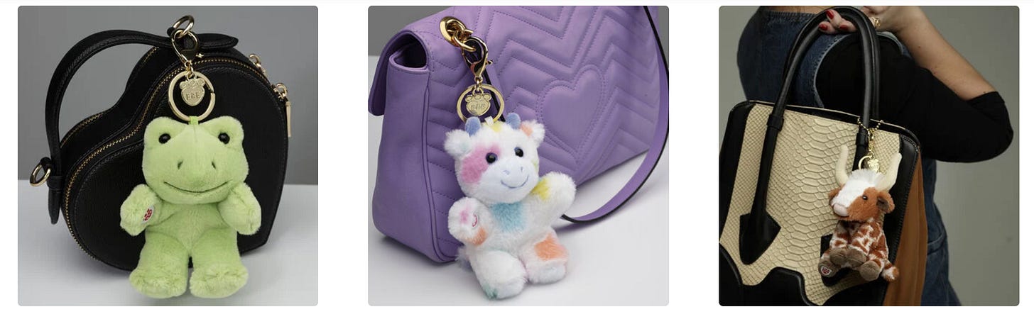 Just sleek, gray-background product photos of their iconic stuffed animals mini-fied and clipped to classy purses.